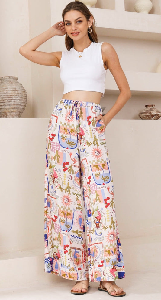 Frida Green/Orange/Blue Print Palazzo Pants